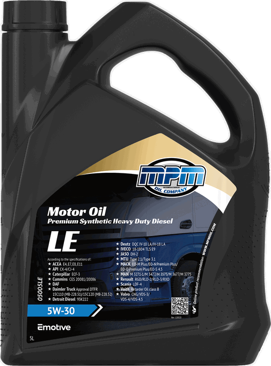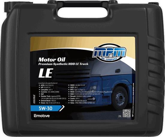 This premium synthetic heavy duty diesel LE motor oil is an advanced fully-synthetic engine oil. It provides superior protection for most modern low emission engines which meet the Euro V and VI standards. This low-sulfur diesel fuel-saving 5W-30 (max. 50 ppm) provides enhanced protection of all exhaust after-treatment systems such as Diesel Particulate Filter (DPF), Selective Catalytic Reduction (SCR), Exhaust Gas Recirculation (EGR) and Continuously Regeneration Traps (CRT). The improved wear protection properties of the blend contributes to the durability of the engine, and this superior 5W-30 engine oil offers the option of extended drain intervals in a wide range of commercial, industrial, off-road, plant and agriculture vehicles. Also recommended for certain engines running on natural gas (CNG), as specified by the manufacturer.