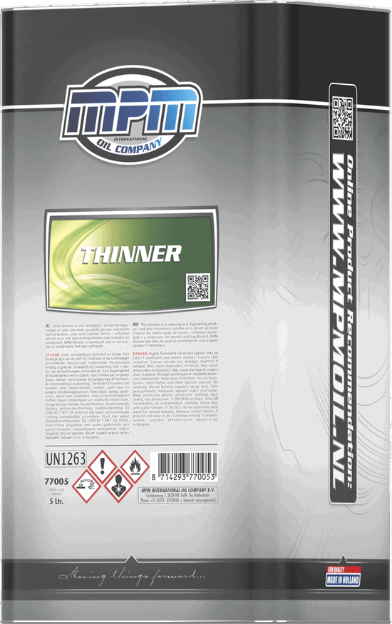This thinner is a cleaning and degreasing product and also extremely suitable as a universal paint thinner for many types of (nitro-) cellulose paints and is a degreaser for metals and hardboard. MPM thinner can also be used in combination with a paint sprayer if necessary.